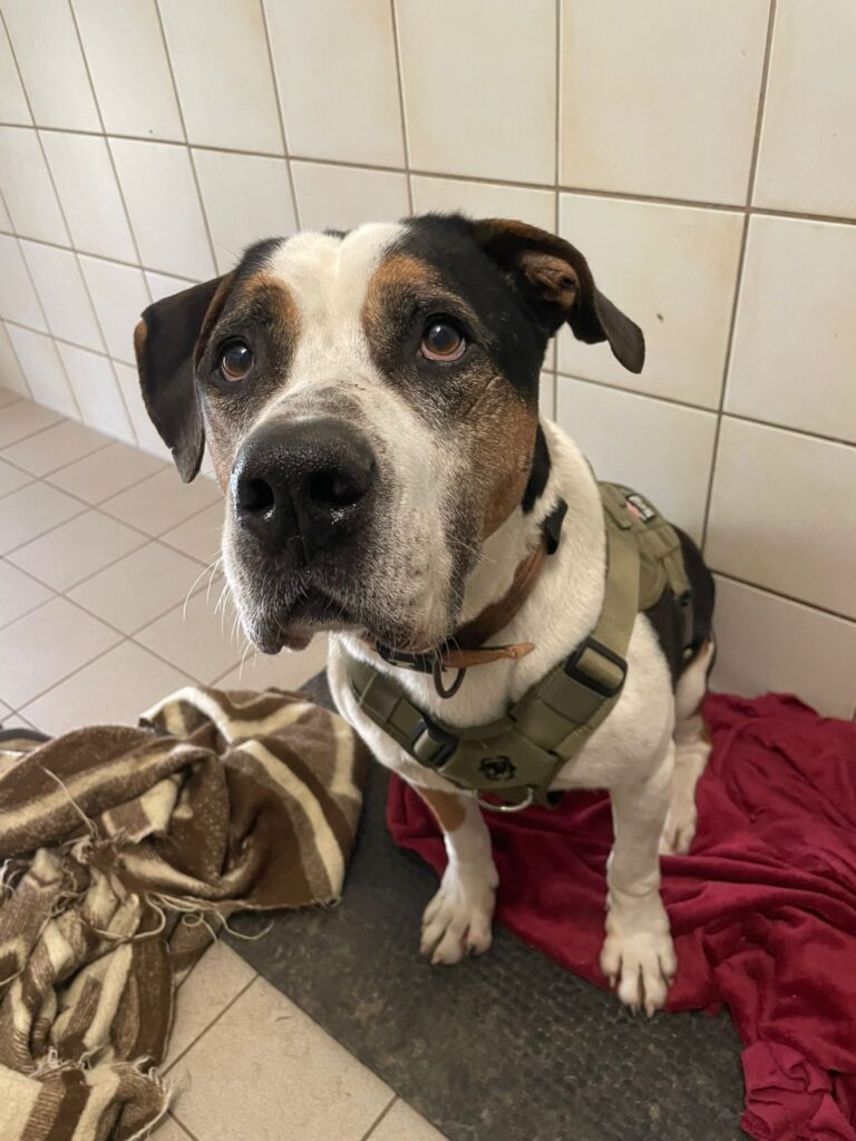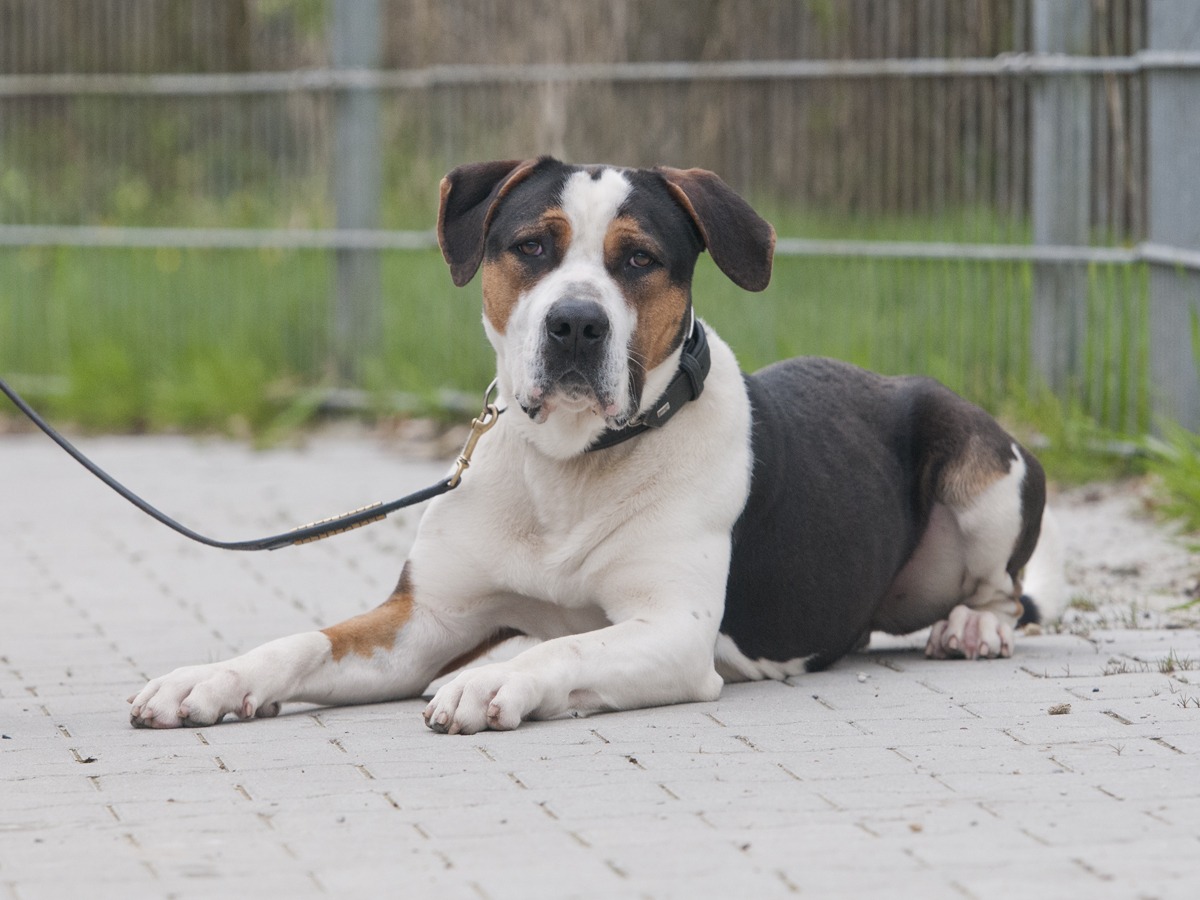 Tyson trägt problemlos einen Maulkorb und kennt strukturierte Spaziergänge. Mit klarer Führung und Management ist ein entspannter Alltag gut möglich.