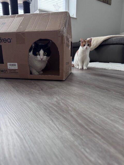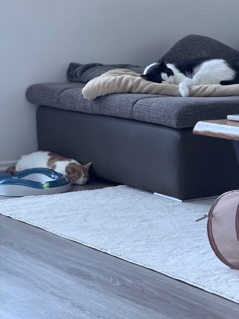Schon ein paar Tage später war es soweit und ich durfte aus dem Tierheim aus und bei ihnen einziehen. Am nächsten Tag habe ich bereits meinen neuen Kumpel Oreo kennengelernt, mit dem ich direkt spielen wollte. Ich wurde immer mutiger und entpuppte mich als kleiner, neugieriger Wirbelwind, der fleißig sein neues Zuhause erkundete. Ich habe mich mittlerweile sehr gut hier eingelebt und mir wird immer sehr viel gespielt, am liebsten spiele ich natürlich fangen durchs ganze Haus mit Oreo (ich halte ihn ordentlich auf Trab :))
